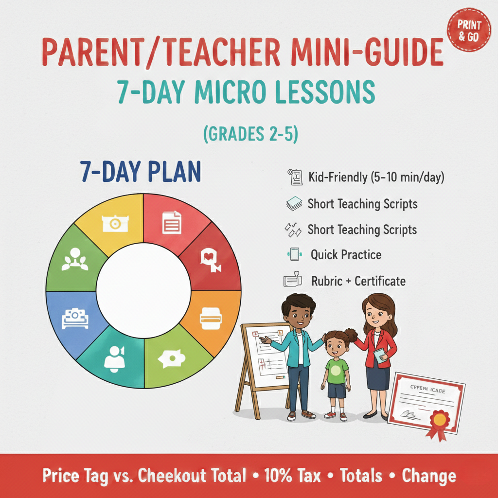 Parent/Teacher Mini-Guide + 7-Day Micro Lessons is a ready-to-use teaching companion for JJ and Andrea at the Park: Understanding Sales Tax (Grades 2–5). It provides a simple 7-day plan (5–10 minutes per day) with kid-friendly vocabulary, short teaching scripts, and quick practice to help children understand price tag vs. checkout total, what percent means, how to calculate 10% sales tax, totals, and change. It also includes common mistakes to watch for, a 5-question exit ticket, and a quick rubric (plus an optional certificate) to confirm learning.
