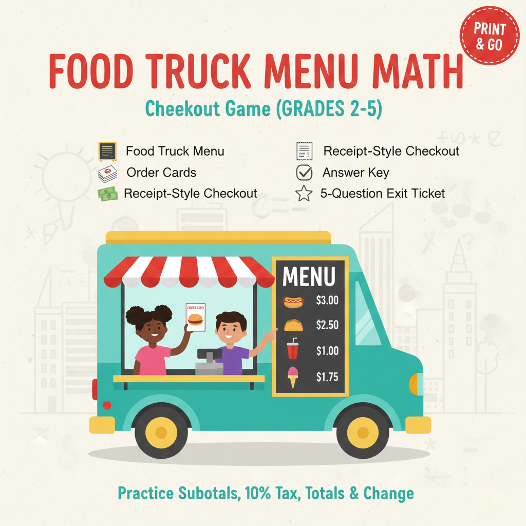 Food Truck Menu Math is a print-and-go checkout game (Grades 2–5) that helps kids understand how sales tax changes the total at checkout. It includes a food truck menu, order cards (easy to challenge levels), a receipt-style checkout sheet, and play money to practice subtotals, 10% tax, totals, and change. An answer key and 5-question exit ticket make it easy for parents and teachers to check understanding.