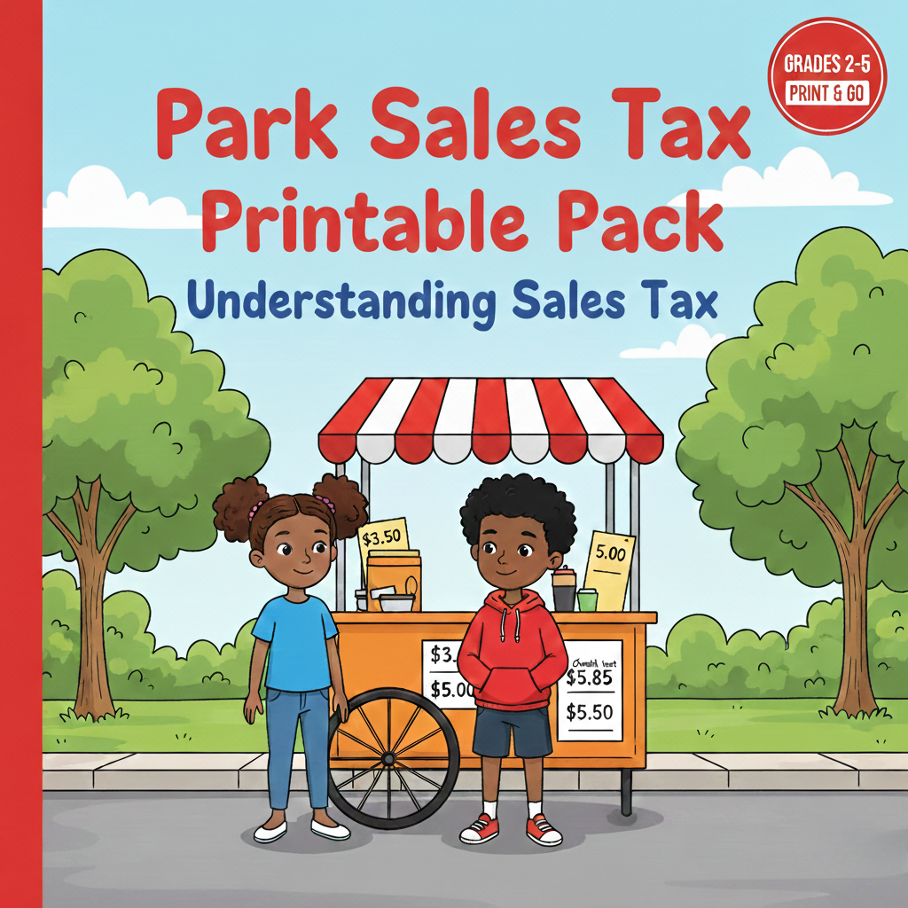 The Park Sales Tax Printable Pack is a print-and-go practice PDF for Grades 2–5 that extends the book JJ and Andrea at the Park: Understanding Sales Tax with structured, real-world math practice. It includes a “What We Learned” concept page, progressive practice sheets (tag price vs. checkout total, finding 10% sales tax, calculating full totals, and checking change), a step-by-step answer key, and a 5-question Exit Ticket to confirm understanding—plus a Certificate of Completion at the end.